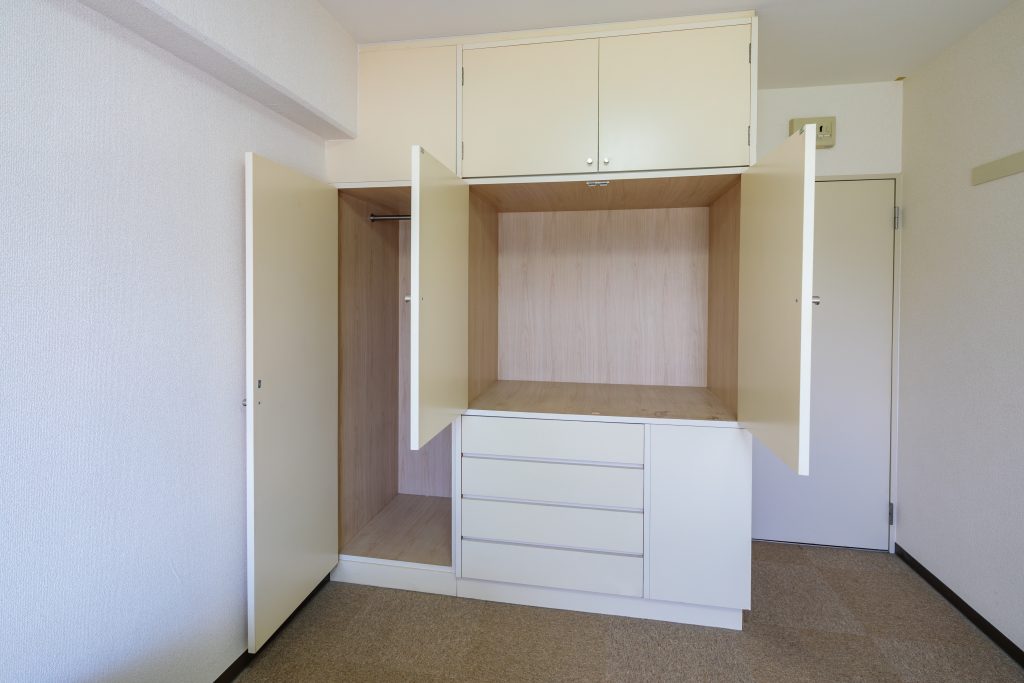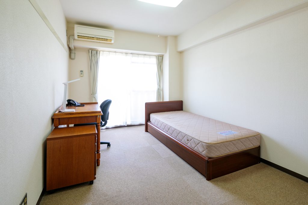 お部屋はゆったり約8畳で、収納が大きいのが嬉しいポイント。 「バストイレが部屋にない」と聞くと驚かれるかもしれませんが、実は「面倒な水回りの掃除が一切不要なのがいい」と、寮生の間では好評です。その分、部屋全体を趣味や勉強に広々と使え、自分だけの快適な空間を手に入れることができます。